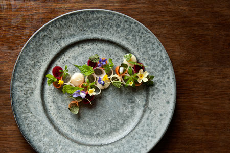 «Κοίτα να δεις έγνοια οι Δανοί για το art de la table», μόλις που πρόλαβα να σκεφτώ όταν άρχισε να εξηγεί τα εδέσματα που συναποτελούσαν την ανθοσύνθεση (!): Βρώσιμα λουλούδια (nasturtium), γεμιστά με αποξηραμένα σαλιγκάρια κολλημένα στο κέντρο του άνθους με ένα είδος αρωματικής κρέμας, και κλαδιά όμοια με χαμόκλαδα του δάσους, τηγανητά πιτάκια στην πραγματικότητα, καμωμένα με αλεύρι βύνης και μπίρα. Οι οδηγίες σαφείς: το άνθος πρέπει να φαγωθεί ολόκληρο, με την κρέμα και το σαλιγκάρι, σε μια μπουκιά. Όπερ και εγένετο. Η αίσθηση ότι έχεις σκύψει στο χώμα και τρως σαν χορτοφάγο ζώο υποχώρησε γρήγορα μπροστά στην ενδιαφέρουσα -είναι η αλήθεια- γεύση: μια ευχάριστη «λουλουδίλα» που συμπληρωνόταν από την αρωματική κρέμα και αποκτούσε υπόσταση με τη σφιχτή, γευστική σάρκα του σαλιγκαριού. Τα κλαδιά τραγανά, με χαρακτηριστική τη μεστή γεύση της βύνης. Απόγευμα Πέμπτης, ώρα 6.30 μ.μ., η περιπέτεια είχε μόλις ξεκινήσει με μια μικρή βόλτα στο δάσος. Θα κρατούσε κοντά πέντε ώρες.