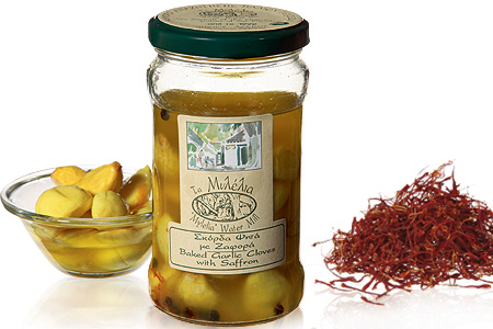 «Σκόρδα σε βάζο;» θα αναρωτιέστε. Και εξηγούμαι. Πρόκειται για ολόκληρες σκελίδες σκόρδου φουρνισμένες και εν συνεχεία βυθισμένες σε έξτρα παρθένο λάδι αρωματισμένο διακριτικά και «κιτρινισμένο» φυσικά από ίνες σαφράν. Το ψήσιμο αφαιρεί σημαντικό μέρος από την αψάδα του σκόρδου καθώς και την έντονη οσμή του, αφήνοντας μια ωραία ζωηρή αλλά όχι ενοχλητική μυρωδιά και κάνοντάς το πιο εύπεπτο. Οι σκελίδες δεν είναι μαλακές αλλά «τραγανές» και άρα «σηκώνουν» μαγείρεμα, ενώ το αρωματισμένο σκορδόλαδο μην το αφήσετε να πάει χαμένο. Αξιοποίησα αμφότερα σε ένα πάναπλο ριζότο μαγειρεμένο με λευκό κρασί. Ψιλόκοψα 4 από τις σκελίδες, τις τσιγάρισα σε 2 κουταλιές από το λάδι, εν συνεχεία προσέθεσα το ρύζι, έσβησα με το κρασί και μαγείρεψα το ριζότο με σταδιακή προσθήκη ζωμού λαχανικών και συνεχές ανακάτεμα μέχρι να χυλώσει. Στο τέλος, λίγη τριμμένη παρμεζάνα και ψιλοκομμένα φυλλαράκια βασιλικού. Μούρλια.