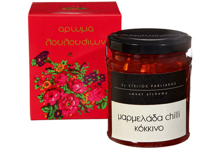 Μια λιχουδιά σε κόκκινο, φλογερό χρώμα και με εξίσου φλογερή γεύση, που ετοιμάζεται υπό την επιμέλεια του Στέλιου Παρλιάρου. Φτιάχνεται από κατακόκκινες, καυτερές πιπεριές και ζάχαρη, και, όσο απλό ακούγεται, τόσο νόστιμη και πικάντικη είναι ετούτη η μαρμελάδα.