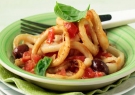 Τηγανίζουμε καλαμαράκια, χωρίς αλεύρι, και, αφού ροδίσουν, τα «γλυκαίνουμε» προσθέτοντας ντομάτα και μαγειρεύοντας για ολίγα ακόμη λεπτά.