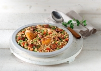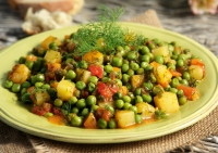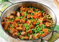 Μοσχαράκι κοκκινιστό με καταπράσινο αρακά και αρωματικό δυόσμο.