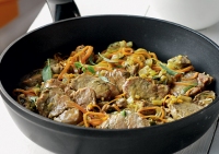Υλικά για 4 άτομα: περίπου 1½ φλιτζ. τσαγιού υπόλοιπο ψητό ψαρονέφρι ή κοτόπουλο ή μπριζόλα, σε κυβάκια, 1 πακέτο φαρφάλες ή άλλο ζυμαρικό της αρεσκείας μας, 200 γρ. φρέσκα μανιτάρια λευκά, 3 σκελίδες σκόρδου, ψιλοκομμένες 1/3 φλιτζ. τσαγιού ελαιόλαδο, 1...