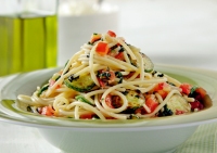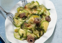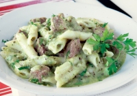 Υλικά (για 4 άτομα): 2 φλιτζ. τσαγιού λεμονάτο κρέας με κολοκυθάκια, 500 γρ. πένες ή άλλο ζυμαρικό, 2 σκελίδες σκόρδου, ψιλοκομμένες (αν θέλουμε), 1 κουτ. σούπας ξερή ρίγανη ή δυόσμος, τριμμένα, 70 ml ελαιόλαδο, 2 κουτ. σούπας φύλλα μαϊντανού, ψιλοκομμένα (αν...
