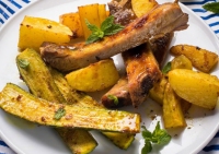 Μεζεκλίδικο φαγητό που γίνεται πιο «οικογενειακό» με την προσθήκη των πατατών και των κολοκυθιών. Τρώγεται με τα χέρια (τα παϊδάκια) και πιρούνι (τα λαχανικά).