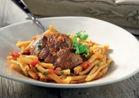 Φτιάχνουμε το κλασικό μοσχαράκι κοκκινιστό αλλά με αρκετό κόκκινο κρασί, πολλά μυρωδικά και χωριάτικα ζυμαρικά όπως μακαρούνες ή στριφτάρια!