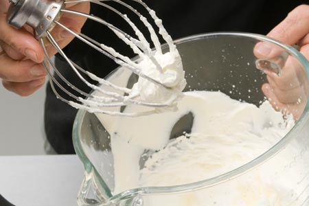 Η σαντιγί γίνεται με κρέμα γάλακτος πλήρη σε λιπαρά, όχι light. Αγοράζουμε δηλαδή μια κρέμα με 35% - 36% λιπαρά (το ποσοστό αναγράφεται επάνω στη συσκευασία). Για να τη φτιάξουμε, ρίχνουμε την ποσότητα κρέμας που χρειαζόμαστε σε ένα βαθύ μπολ και τη χτυπάμε με το σύρμα του μίξερ, αρχικά σε χαμηλή ταχύτητα γιατί θα πιτσιλάει, αλλά όσο σφίγγει, σε πιο δυνατή. Σταδιακά θα αρχίσει να πήζει και να αφρατεύει. Πριν γίνει σαντιγί, θα αποκτήσει την παχύρρευστη όψη του γιαουρτιού. Για να δούμε αν είναι έτοιμη, σταματάμε το μίξερ και το ανασηκώνουμε: θα πρέπει να σχηματίζονται «μύτες» εκεί όπου πριν βρίσκονταν οι αναδευτήρες του μίξερ. Προσέχουμε μόνο να μην την παραχτυπήσουμε, γιατί θα διαχωριστεί το γάλα από τα στερεά και θα «κόψει» η κρέμα. Θα το καταλάβουμε γιατί θα κιτρινίσει η σαντιγί, θα ξεφουσκώσει και θα δούμε να υπάρχει υγρό.