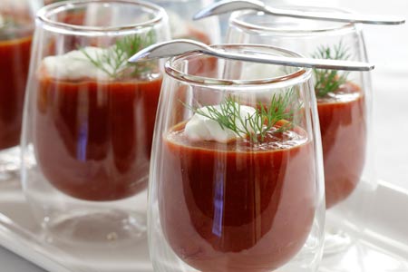 Μοιράζουμε την κρύα σούπα σε σφηνάκια, σε ποτηράκια ή σε μπολάκια, γεμίζοντάς τα μέχρι τη μέση. Γαρνίρουμε με λίγο από το μείγμα γιαουρτιού - λεμονιού, διακοσμούμε με τα φυλλαράκια άνηθου και σερβίρουμε.