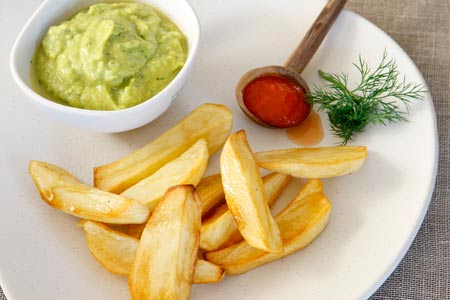 Τηγανητές πατάτες με σπιτική κέτσαπ και ντιπ αρακά