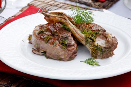 - 3 κιλά αρνάκι γάλακτος (ή κατσικάκι), από σπάλα και μπούτι, κομμένο σε κομμάτια-μερίδες βάρους περίπου 300 γρ. το καθένα