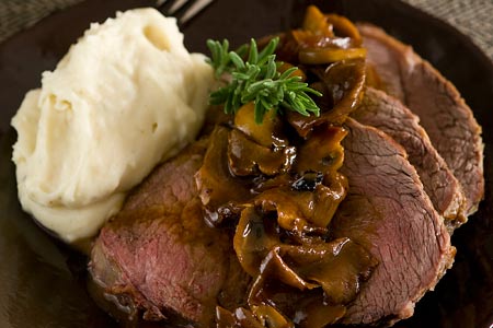 Ψητό μοσχάρι με κρασάτη σάλτσα και πουρέ