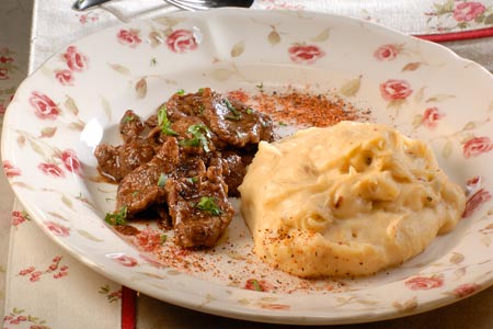 Γλυκόξινο μοσχάρι με πικάντικο πουρέ πατάτας