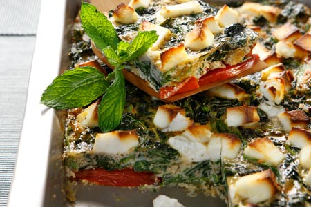 Ομελέτα στο ταψί με βλίτα, ψητές ντομάτες και μανούρι