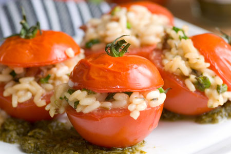 Μαγειρεμένη, αρωματική γέμιση μέσα σε ωμή ντομάτα. Τι ωραία κόντρα!
