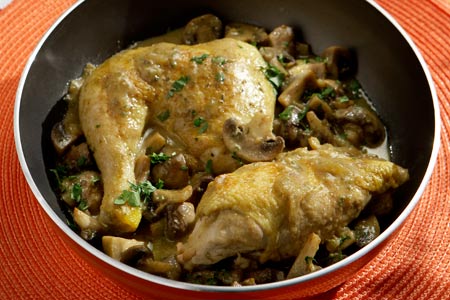 Οταν το φαγητό μας είναι έτοιμο, παίρνουμε 1/2 κουτάλα από τη σάλτσα του κοτόπουλου (μαζί με 2 - 3 κομμάτια από τα μανιτάρια και κρεμμύδια) και τη χτυπάμε στο μούλτι μαζί με τη μουστάρδα, τη ρίγανη, αλάτι, φρεσκοτριμμένο πιπέρι και το υπόλοιπο ελαιόλαδο. Περιχύνουμε με αυτό το μείγμα το φαγητό, κουνάμε λίγο την κατσαρόλα, δυναμώνουμε τη φωτιά και αφήνουμε να πάρει μια βράση ώστε να δέσει η σάλτσα. Αποσύρουμε, πασπαλίζουμε με το μαϊντανό και σερβίρουμε. Μπορούμε να το συνοδεύσουμε με πράσινη σαλάτα, με πατάτες τηγανητές, με πιλάφι ή απλώς με ψωμί.