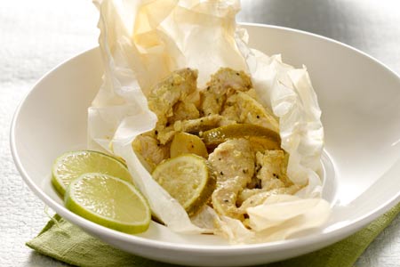 Διαδικασία Σε ένα μπολ βάζουμε το ελαιόλαδο, το γάλα καρύδας, το χυμό λάιμ, όλα τα μπαχαρικά, αλάτι και πιπέρι. Ανακατεύουμε καλά. Βάζουμε στο μπολ το κοτόπουλο και ανακατεύουμε να βραχεί καλά από το αρωματικό μείγμα. Αφήνουμε το κοτόπουλο στην άκρη μέχρι να προθερμανθεί ο φούρνος και να ετοιμάσουμε τα πακέτα. Προθερμαίνουμε καλά το φούρνο στους 200° C.