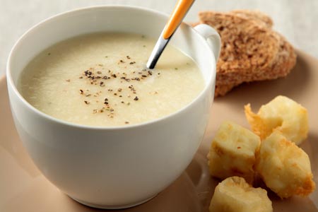 Σερβίρουμε την κρεμώδη σούπα σε βαθιά πιάτα και βάζουμε από μερικά κυβάκια στο κέντρο της σούπας, την τελευταία στιγμή πριν από το σερβίρισμα, για να παραμείνουν τραγανά. Πασπαλίζουμε με φρεσκοτριμμένο πιπέρι και σερβίρουμε με φρυγανισμένο ψωμί.