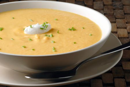 Πολτοποιούμε με το ραβδομπλέντερ (ή στο μπλέντερ ή στο μούλτι σε δόσεις) το περιεχόμενο της κατσαρόλας μέχρι να γίνει μια λεία, βελούδινη σούπα. Αν η σούπα βγει πολύ πηχτή, προσθέτουμε λίγο νερό και τη βάζουμε να πάρει 1-2 βράσεις. Αν είναι πιο ρευστή από όσο μας αρέσει, τη σιγοβράζουμε μέχρι να πήξει σύμφωνα με το γούστο μας. Δοκιμάζουμε το αλατοπίπερο.