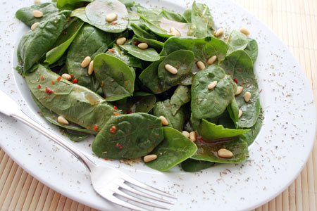 «Τραβάμε» τα αχλάδια από τη λεκάνη με μια κουτάλα και τα αφήνουμε στην άκρη. Βάζουμε στη λεκάνη το σπανάκι και τα φρέσκα κρεμμυδάκια και ανακατεύουμε καλά να λαδωθούν. Αν χρειάζεται, διορθώνουμε το αλατοπίπερο. Απλώνουμε τη σαλάτα σε μια μεγάλη πιατέλα (ή σε ατομικά πιάτα) και γαρνίρουμε με τα αχλάδια, τα κουκουνάρια και τους σπόρους ροδιού.