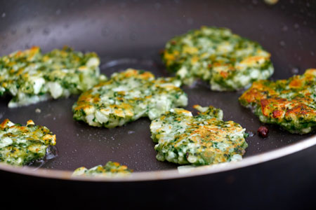 Σε ένα τηγάνι βάζουμε λάδι 1/2 εκ. από τον πυθμένα του. Το ζεσταίνουμε πολύ καλά σε μέτρια φωτιά. Βάζουμε κουταλιές από το μείγμα τις οποίες «πατάμε» λίγο με το κουτάλι να γίνουν πλακέ σαν τηγανίτες. Ψήνουμε ομοιόμορφα και από τις δύο πλευρές, μέχρι να ροδίσουν καλά. Αν χρειαστεί προσθέτουμε λίγο λάδι, για να βγουν όλες οι τηγανιές. Στραγγίζουμε κάθε δόση σε χαρτί κουζίνας. Σερβίρουμε με ψωμί, φρέσκια πράσινη σαλάτα, ταραμοσαλάτα κι ελιές.