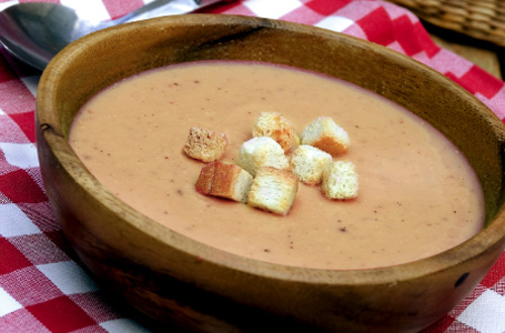 Κρουτόν: Σε ένα τηγάνι ζεσταίνουμε το ελαιόλαδο και τηγανίζουμε τους κύβους ψωμιού έως ότου ροδίσουν. Αφήνουμε τα κρουτόν να στραγγίξουν σε χαρτί κουζίνας. Σερβίρουμε τη σούπα σε μπολ και γαρνίρουμε με τα κρουτόν.