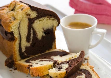 Βουτυρώνουμε και αλευρώνουμε μια μακρόστενη φόρμα του κέικ 25 x 11 εκ. Ρίχνουμε εναλλάξ στη φόρμα κουταλιές και από τα δύο μείγματα και ψήνουμε για 50 - 60 λεπτά. Βγάζουμε το κέικ, το αφήνουμε για 5 λεπτά μέσα στη φόρμα και το ξεφορμάρουμε.