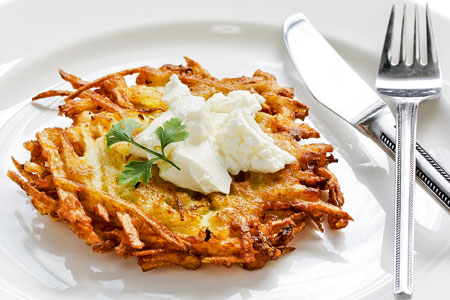 Τριμμένες πατάτες στο τηγάνι με σάλτσα γιαουρτιού