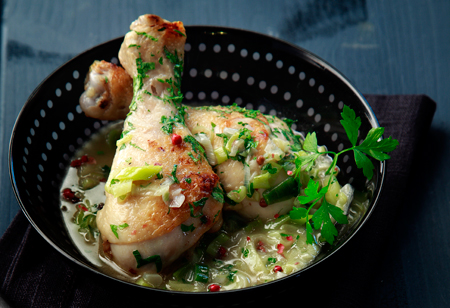 Μπουτάκια κοτόπουλου με πράσα και ροζ πιπέρι