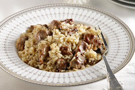 Περίπου 10 λεπτά προτού ολοκληρωθεί το μαγείρεμα του κρέατος, βάζουμε σε άλλη κατσαρόλα τις 2 κουταλιές βούτυρο και τσιγαρίζουμε το ρύζι, ανακατεύοντάς το διαρκώς μέχρι να αρχίσει να παίρνει ελαφρώς ξανθό χρώμα, για περίπου 10 λεπτά. Μόλις είναι έτοιμο το κρέας, το βγάζουμε με τρυπητή κουτάλα σε μια πιατέλα και το σκεπάζουμε. Μετράμε το υγρό και συμπληρώνουμε όσο χρειάζεται για να είναι 900 ml - 1 λίτρο. Ρίχνουμε το τσιγαρισμένο ρύζι, ανακατεύουμε, αλατίζουμε και το αφήνουμε να μαγειρευτεί - από τη στιγμή που θα κοχλάσει, μετράμε περίπου 10 λεπτά.