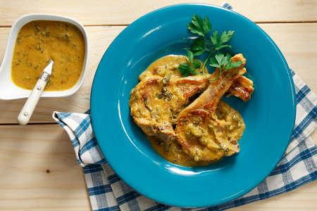 Μπριζόλες χοιρινές στο τηγάνι με σάλτσα λαχανικών