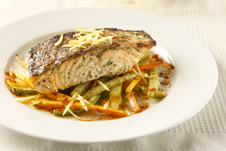Μαρινάρισμα και ψήσιμο: Απλώνουμε τα κομμένα λαχανικά σ’ ένα ταψί που να τα χωράει σε μονή στρώση, τα περιχύνουμε με τη μισή σάλτσα και ανακατεύουμε να πάει παντού. Τα φουρνίζουμε για 15 λεπτά. Εν τω μεταξύ, βάζουμε τα φιλέτα σολομού σε ένα βαθύ μπολ, τα περιχύνουμε με την υπόλοιπη σάλτσα και ανακατεύουμε να καλυφθούν καλά. Τα αφήνουμε να μαριναριστούν για όση ώρα ψήνονται τα λαχανικά. Μόλις περάσουν τα 15 λεπτά, τραβάμε το ταψί και βάζουμε πάνω στα λαχανικά τα φιλέτα του σολομού με τη σάλτσα τους. Αλλάζουμε τη λειτουργία του φούρνου στο γκριλ και ψήνουμε για άλλα 5-7 λεπτά τα ψάρια από κάθε πλευρά, ώσπου να ψηθούν. Ξεφουρνίζουμε το φαγητό, περιχύνουμε με το χυμό λεμονιού, πασπαλίζουμε με το ξύσμα και το κοκκινοπίπερο και σερβίρουμε.