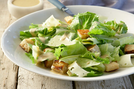Σαλάτα: Βάζουμε τα χοντροκομμένα μαρούλια σε ένα μεγάλο μπολ, προσθέτουμε όσο ντρέσινγκ επιθυμούμε (το υπόλοιπο το διατηρούμε στο ψυγείο για μελλοντική χρήση), ανακατεύουμε καλά και γαρνίρουμε με τα κρουτόν και το τυρί.