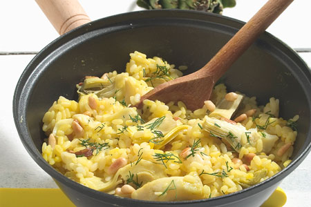Σε μια μεσαίου μεγέθους κατσαρόλα ζεσταίνουμε το λάδι σε μέτρια φωτιά και σοτάρουμε το κρεμμύδι μέχρι να μαραθεί, για 3-4 λεπτά. Προσθέτουμε το σκόρδο και το ρύζι και συνεχίζουμε το σοτάρισμα για 3-4 λεπτά μέχρι να λαδωθούν καλά οι κόκκοι του ρυζιού. Αλατοπιπερώνουμε και σβήνουμε με το κρασί. Μόλις εξατμιστεί, ξεκινάμε τη σταδιακή προσθήκη του ζωμού ή του νερού. Κάθε φορά προσθέτουμε 1 κουτάλα υγρό και ανακατεύουμε με μια ξύλινη σπάτουλα μέχρι να απορροφηθεί όλη η ποσότητα του υγρού, οπότε προσθέτουμε την επόμενη δόση. Αυτή η διαδικασία θα πάρει περίπου 20 λεπτά. Στα τελευταία 5 λεπτά προσθέτουμε τις αγκινάρες (εκτός και αν είναι σκληρές, οπότε τις βάζουμε πιο πριν) και συνεχίζουμε μέχρι το ριζότο να χυλώσει αλλά οι κόκκοι του ρυζιού να κρατάνε στο κέντρο. Τότε, προσθέτουμε λίγη τριμμένη παρμεζάνα, το κουκουνάρι, το ξύσμα λεμονιού και τον άνηθο ή το μάραθο και ανακατεύουμε. Αποσύρουμε από τη φωτιά, ελέγχουμε το αλατοπίπερο και αφήνουμε το ριζότο να ξεκουραστεί για 5-6 λεπτά. Σερβίρουμε πασπαλίζοντας κάθε μερίδα με λίγη παρμεζάνα ακόμη.