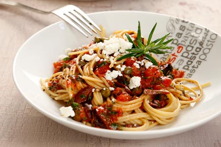 Μακαρόνια με ντομάτα, κάππαρη και ανθότυρο