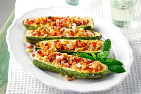 Κολοκυθάκια «παπουτσάκια» με λουκάνικο, ντομάτα και φέτα