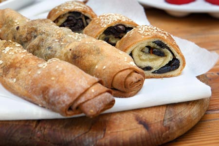 Ελιόπιτες: Χωρίζουμε τη ζύμη σε 10 ισομεγέθη κομμάτια. Σε ελαφρώς αλευρωμένη επιφάνεια, ανοίγουμε κάθε κομμάτι σε λεπτό ορθογώνιο φύλλο διαστάσεων 20x30 εκ. περίπου. Προθερμαίνουμε το φούρνο στους 180° C. Απλώνουμε από λίγη γέμιση σε όλη την επιφάνεια κάθε φύλλου (εκτός από τις άκρες) και τυλίγουμε σε ρολό. Βάζουμε τα ρολά σε λαδωμένο ταψί και τα πασπαλίζουμε με σουσάμι. Ψήνουμε για περίπου 40 λεπτά ή μέχρι να ροδίσουν οι ελιόπιτες.