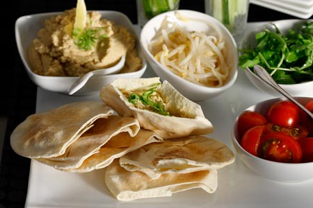 Πιτάκια και σερβίρισμα: Προθερμαίνουμε το φούρνο στους 180° C. Μ’ ένα μαχαιράκι κάνουμε μια τομή στα πιτάκια από τη μία τους άκρη, έτσι ώστε να σχηματιστούν θήκες. Ζεσταίνουμε τα πιτάκια στο φούρνο για 4 - 5 λεπτά. Δεν θέλουμε να ξεραθούν.