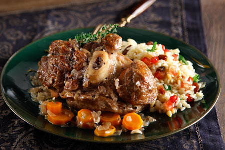 Οσομπούκο χειμωνιάτικο με κρασί και πιλάφι