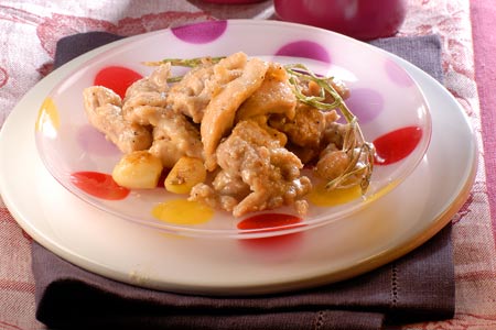 Διαδικασία Ζεσταίνουμε το λάδι σε μια κατσαρόλα ή σε ένα μεγάλο και βαρύ τηγάνι με καπάκι σε μέτρια προς δυνατή φωτιά. Αλευρώνουμε τις λωρίδες κοτόπουλου, τις τινάζουμε ελαφρώς ώστε να απομακρύνουμε το περιττό αλεύρι και τις σοτάρουμε για 3-4 λεπτά στο καυτό λάδι μέχρι να ροδίσουν καλά από όλες τις πλευρές. Τότε προσθέτουμε το σκόρδο, ανακατεύουμε και σβήνουμε με τα δύο είδη κρασιού. Μαγειρεύουμε για 2 λεπτά, μετριάζουμε τη φωτιά, σκεπάζουμε το σκεύος και σιγομαγειρεύουμε για περίπου 10-12 λεπτά ή μέχρι να γίνει το κοτόπουλο. Ελέγχουμε αν έγινε, κόβοντας ένα κομμάτι: αν δούμε ότι στο εσωτερικό του είναι ροζέ, μαγειρεύουμε για λίγο ακόμη. Αν κατά το μαγείρεμα σωθούν νωρίς τα υγρά, προσθέτουμε ελάχιστο ζεστό νερό.