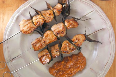 Προθερμαίνουμε το γκριλ του φούρνου στην πιο υψηλή θερμοκρασία. Περνάμε τα κομμάτια κοτόπουλου σε μεταλλικά ή ξύλινα σουβλάκια και ενδιάμεσα βάζουμε τα κομμάτια από τα φύλλα δάφνης. Ακουμπάμε τα σουβλάκια στη σχάρα και τα βάζουμε κάτω από τις αντιστάσεις του γκριλ, στην υψηλότερη θέση του φούρνου, βάζοντας όμως σε χαμηλότερη θέση ένα ταψί με λίγο νερό για να μη λερώσουμε τον φούρνο και «καπνίσει». Τα ψήνουμε για περίπου 15 λεπτά γυρίζοντάς τα από όλες τις πλευρές για να ψηθούν ομοιόμορφα. Μόλις πάρουν χρώμα, ελέγχουμε αν έγιναν, και, αν είναι ψημένα στο εσωτερικό τους, τα αλατοπιπερώνουμε αν χρειάζεται (η σάλτσα λόγω των υλικών είναι λογικά αρκετά αλμυροπικάντικη) και τα σερβίρουμε με την υπόλοιπη σάλτσα. Διαφορετικά τα ψήνουμε για λίγο ακόμη γυρνώντάς τα τακτικά για να μη μας καούν.