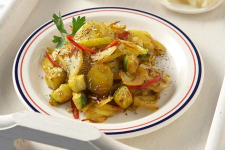 Προσθέτουμε όλα τα υπόλοιπα υλικά (κρεμμύδια, πιπεριές, κολοκυθάκια, τα μπαχαρικά και αλατοπίπερο), ανακινούμε καλά το σκεύος, ώστε να ανακατευτούν και τηγανίζουμε μέχρι να γίνουν οι πατάτες και να μαραθούν και να μαλακώσουν τα υπόλοιπα υλικά, αλλά να μη λιώσουν, για 10 λεπτά περίπου. Μοιράζουμε το φαγητό με τρυπητή κουτάλα στα πιάτα. Συνοδεύουμε με γιαούρτι ή κοπανιστή Μυκόνου ή λευκό τυρί της αρεσκείας μας. Ταιριάζει πολύ και μια απλή ντοματοσαλάτα με ρίγανη και ελαιόλαδο.