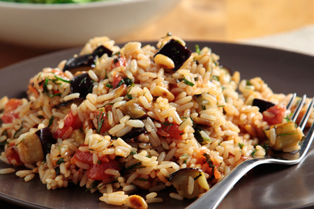 Εν τω μεταξύ, βάζουμε το ρύζι σε ένα ψιλό σουρωτήρι και το ξεπλένουμε με κρύο νερό. Το αφήνουμε να στραγγίξει. Σε μια ρηχή κατσαρόλα ζεσταίνουμε το μισό ελαιόλαδο σε δυνατή φωτιά και τηγανίζουμε τους κύβους μελιτζάνας, ανακατεύοντας συχνά με ξύλινη κουτάλα, μέχρι να ροδίσουν. Αν δεν χωράνε όλοι μαζί στο σκεύος, τους τηγανίζουμε σε δύο δόσεις. Τους στραγγίζουμε σε απορροφητικό χαρτί κουζίνας και τους αφήνουμε κατά μέρος. Στην ίδια κατσαρόλα ζεσταίνουμε το υπόλοιπο ελαιόλαδο και σοτάρουμε το καλά στραγγισμένο ρύζι με το σκόρδο για 1 λεπτό σε μέτρια φωτιά, ανακατεύοντας. Προσθέτουμε 1.200 ml βραστό νερό και το αφήνουμε να κοχλάσει. Προσθέτουμε τις ντομάτες και 2 κοφτά κουτ. γλυκού αλάτι, ανακατεύουμε, χαμηλώνουμε τη φωτιά και σιγοβράζουμε το ρύζι, για περίπου 13 - 14 λεπτά ή μέχρι να γίνει. Οταν είναι έτοιμο, ρίχνουμε τους κύβους μελιτζάνας, το μαϊντανό, το δυόσμο, τον άνηθο και τα κουκουνάρια, ανακατεύουμε και αποσύρουμε την κατσαρόλα από τη φωτιά. Τη σκεπάζουμε με μια πετσέτα, βάζουμε από πάνω το καπάκι της και αφήνουμε κατά μέρος για 10 λεπτά προτού σερβίρουμε.