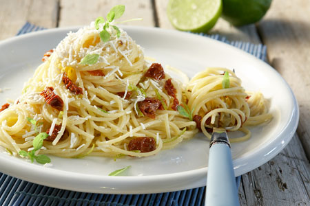 Διαδικασία Βράζουμε τα σπαγγέτι σε αλατισμένο νερό, σύμφωνα με τις οδηγίες που αναγράφονται στη συσκευασία. Σουρώνουμε τα σπαγγέτι και, στη στεγνή πλέον κατσαρόλα όπου τα βράσαμε, ρίχνουμε το ελαιόλαδο και σοτάρουμε το σκόρδο για 20 δευτερόλεπτα, σε δυνατή φωτιά. Προσθέτουμε τα ζυμαρικά και σοτάρουμε για μισό λεπτό ακόμη. Στη συνέχεια, προσθέτουμε τις λιαστές ντομάτες, το χυμό και το ξύσμα από το εσπεριδοειδές που επιλέξαμε, ανακατεύουμε απαλά και αποσύρουμε από τη φωτιά.