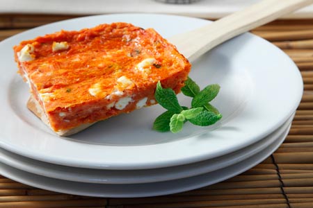 Προθερμαίνουμε το φούρνο στους 180° C. Αλείφουμε με λάδι το ταψί, το πασπαλίζουμε με αλεύρι και αδειάζουμε μέσα το μείγμα της ντομάτας. Πρέπει να είναι το πολύ 1½ δάχτυλο παχύ. Το ψήνουμε μέχρι να δέσει, γύρω στα 40 λεπτά.