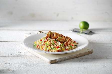 Καστανό Basmati με σουβλάκι σολομού και ξύσμα από λάιμ